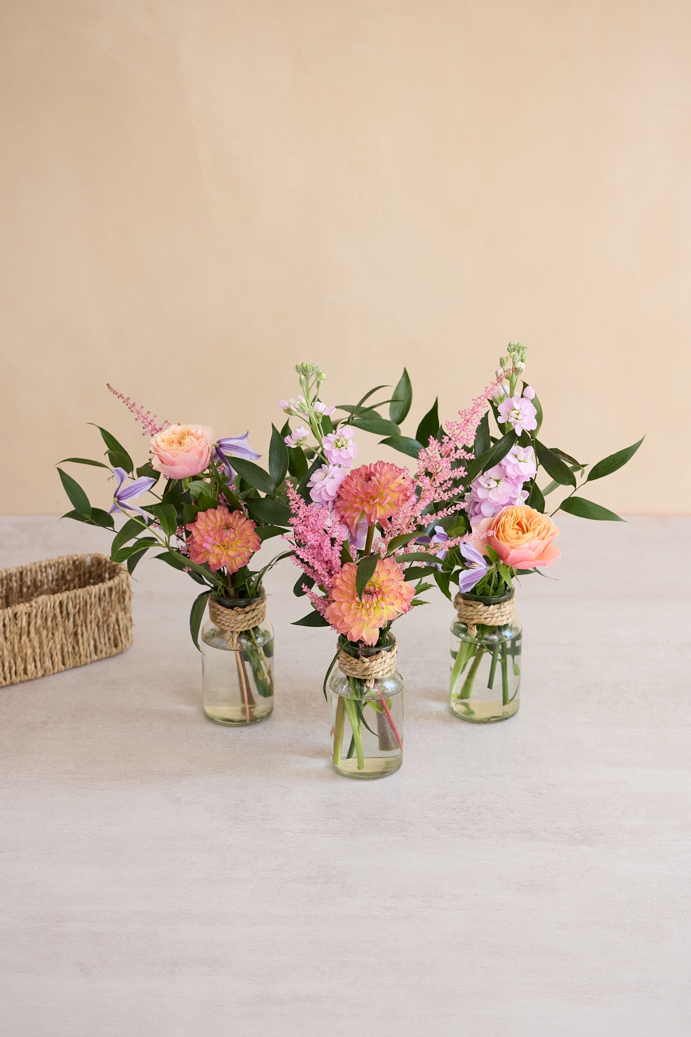 A delicate trio of bud vase arrangements, designed to complement our bright pastels bridal bouquet with soft, joyful tones and premium seasonal flowers. Featuring roses, lisianthus and clematis, each vase is arranged with care to feel light, romantic and thoughtfully balanced.