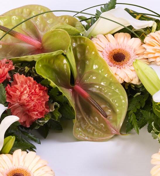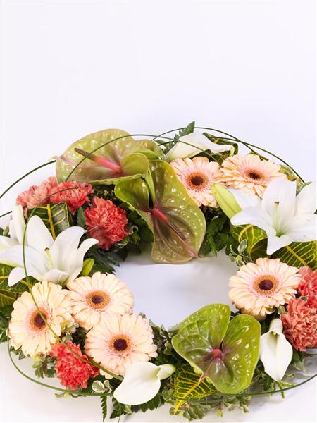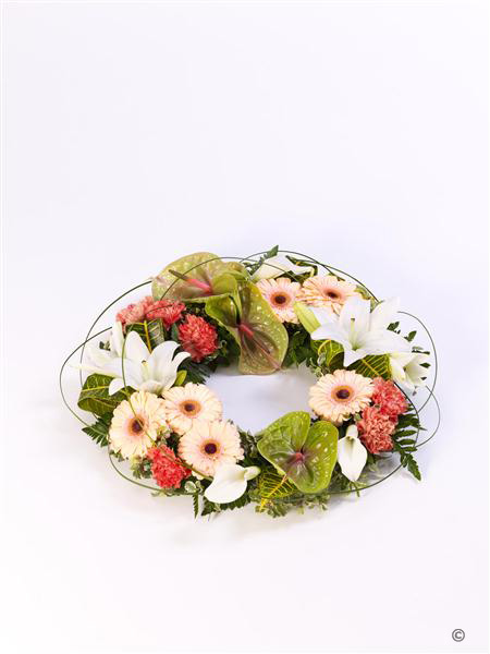 An elegant wreath featuring an exotic mix of anthuriums, calla Lily, Gerbera, Lily and carnations in green, orange and white. Tropical foliage and looped steel grass give it a contemporary feel. Approximate diameter 60cm (23 inches).