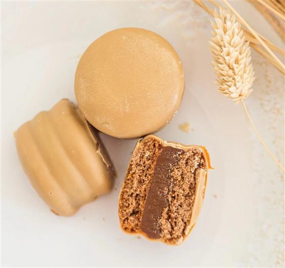 Enjoy a selection of four delicious cookie flavors: Milk Chocolate, Dark Chocolate, White Chocolate, and Caramelized White Chocolate. Each cookie is filled with a smooth dollop of dulce de leche and coated in rich, premium Belgian chocolate.