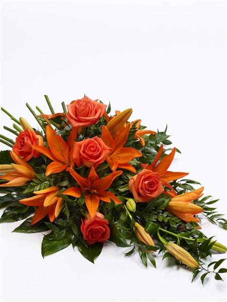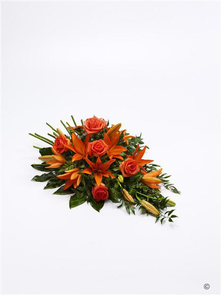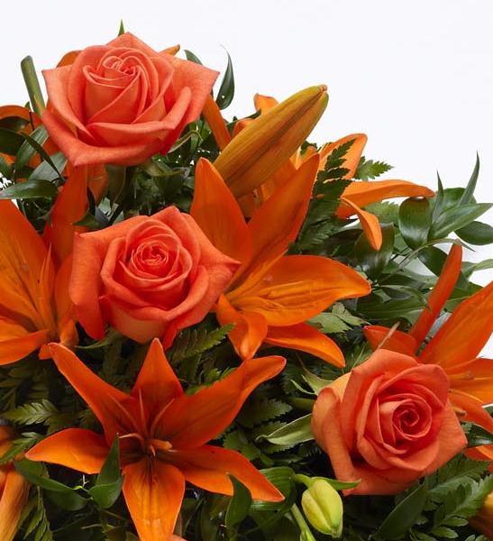 Aralia leaves and French ruscus are nestled amongst classic orange Oriental Lily and orange large-headed roses in this classic teardrop spray with stems. (in oasis).