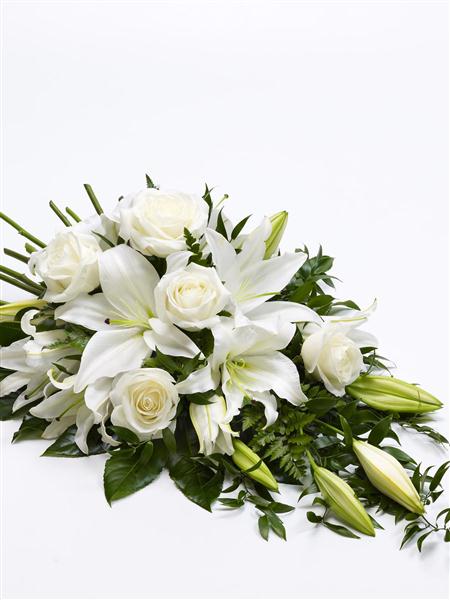 Aralia leaves and French ruscus are nestled amongst classic white Oriental Lily and white large-headed roses in this classic teardrop spray which is designed with the stems coming out of one side of it. Looking like a tied bunch. (In Oasis)