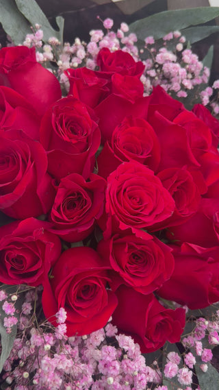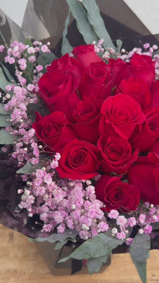 Twenty premium red roses paired with pink gypsophila and phlebodium foliage. Hand-tied with care and presented in a gift box for maximum impact.
