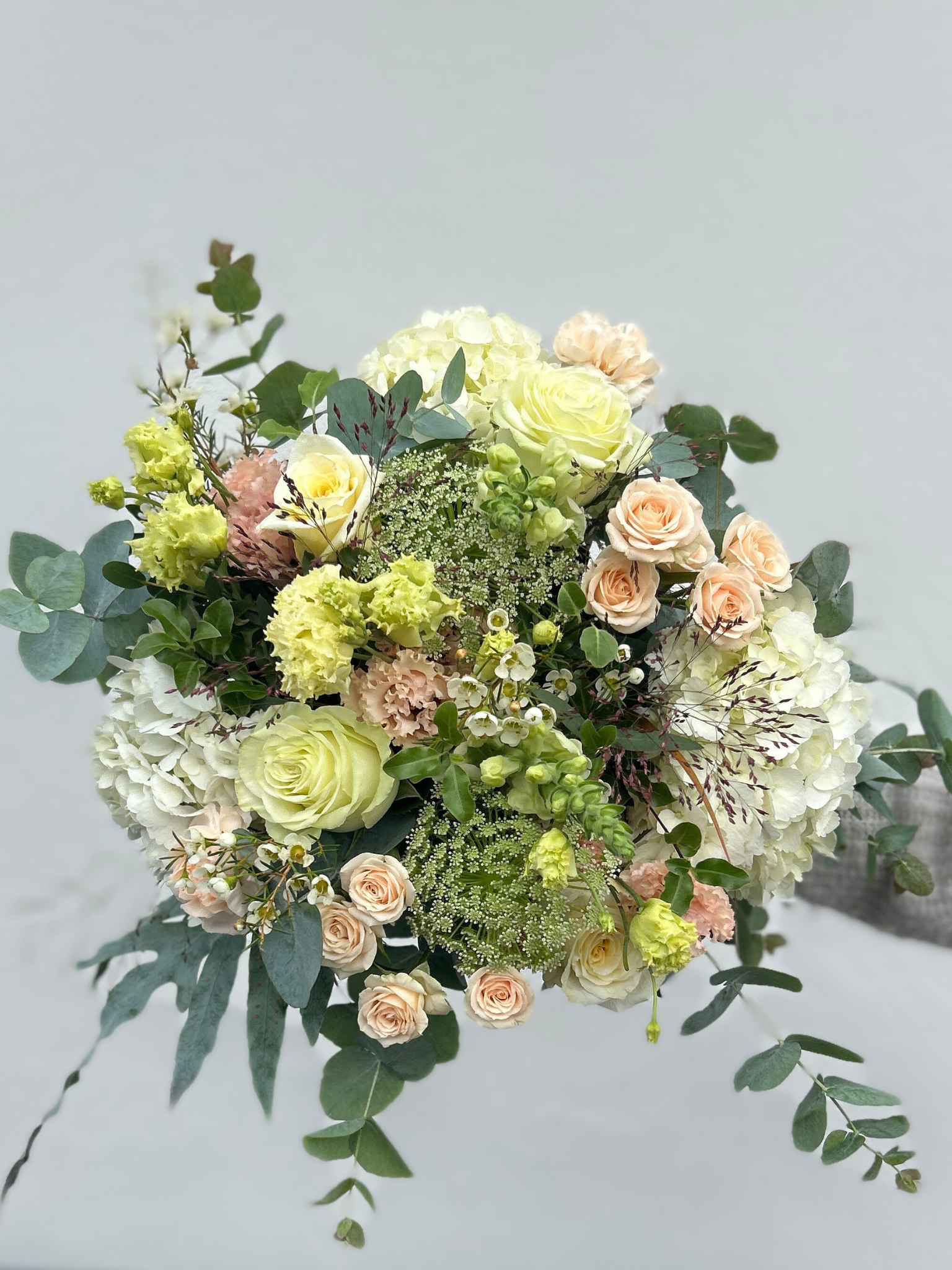 Includes: Roses, Hydrangea, Lisianthus, Eucalyptus, Seasonal Foliage