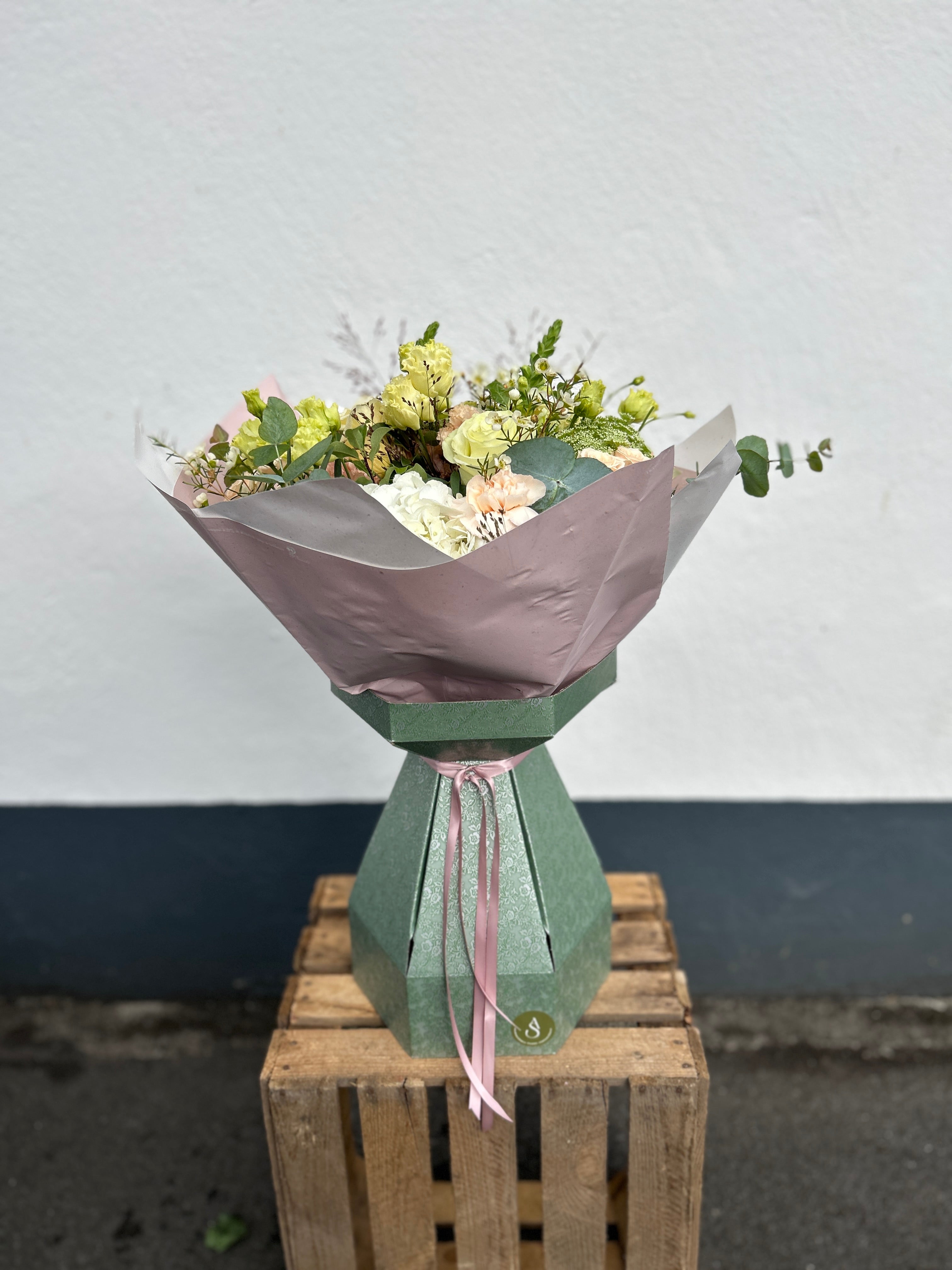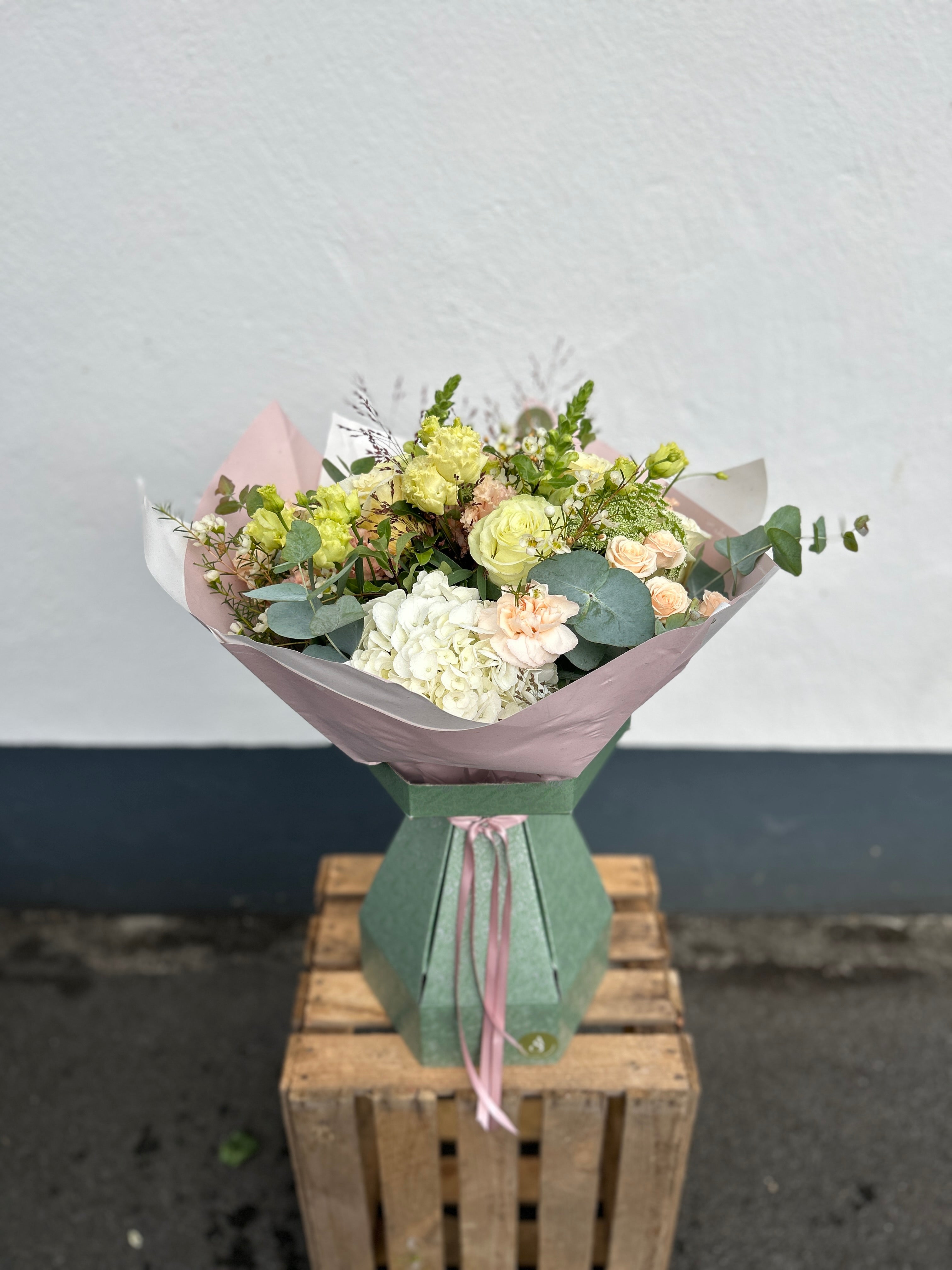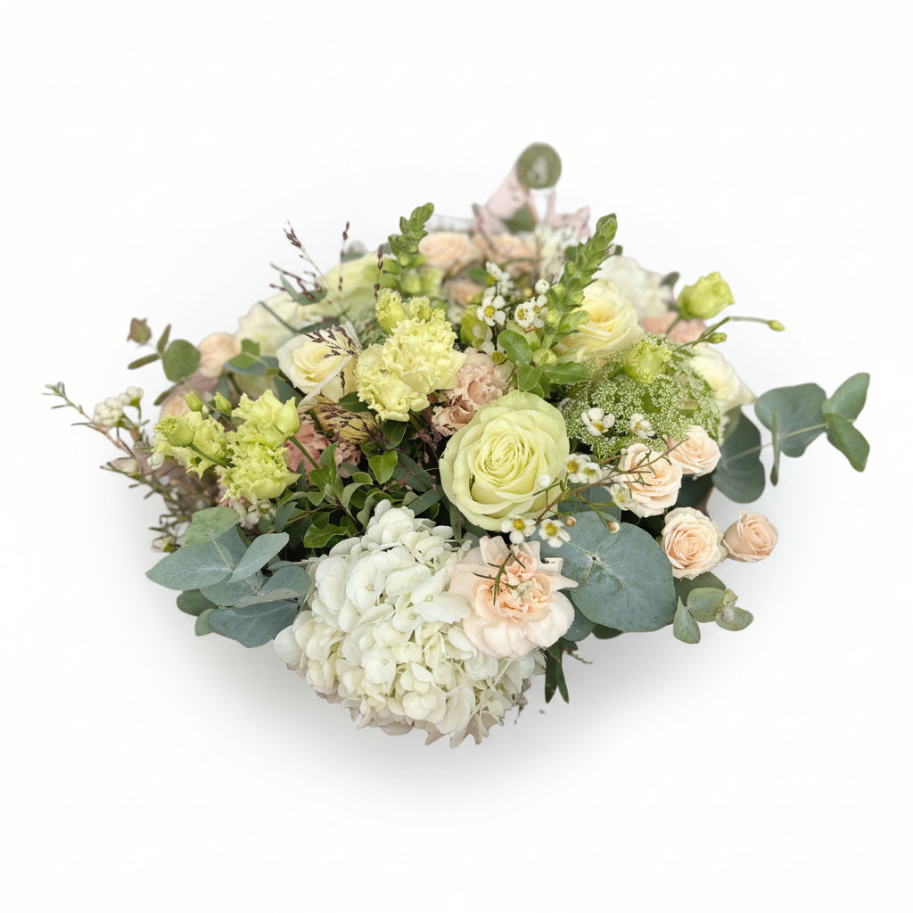 A serene palette of creams, peaches, and gentle greens, Whisper is the embodiment of calm sophistication. Thoughtfully arranged with layers of texture and tone, it’s a bouquet that whispers elegance and grace.